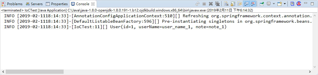package com.springboot.chapter3.config; import org.apache.log4j.Logger; import org.springframework.context.ApplicationContext; import org.springframework.context.annotation.AnnotationConfigApplicationContext; public class IoCTest { private static Logger log = Logger.getLogger(IoCTest.class); public static void main(String[] args) { ApplicationContext ctx = new AnnotationConfigApplicationContext(Appconfig.class); User user = ctx.getBean(User.class); log.info(user); } }